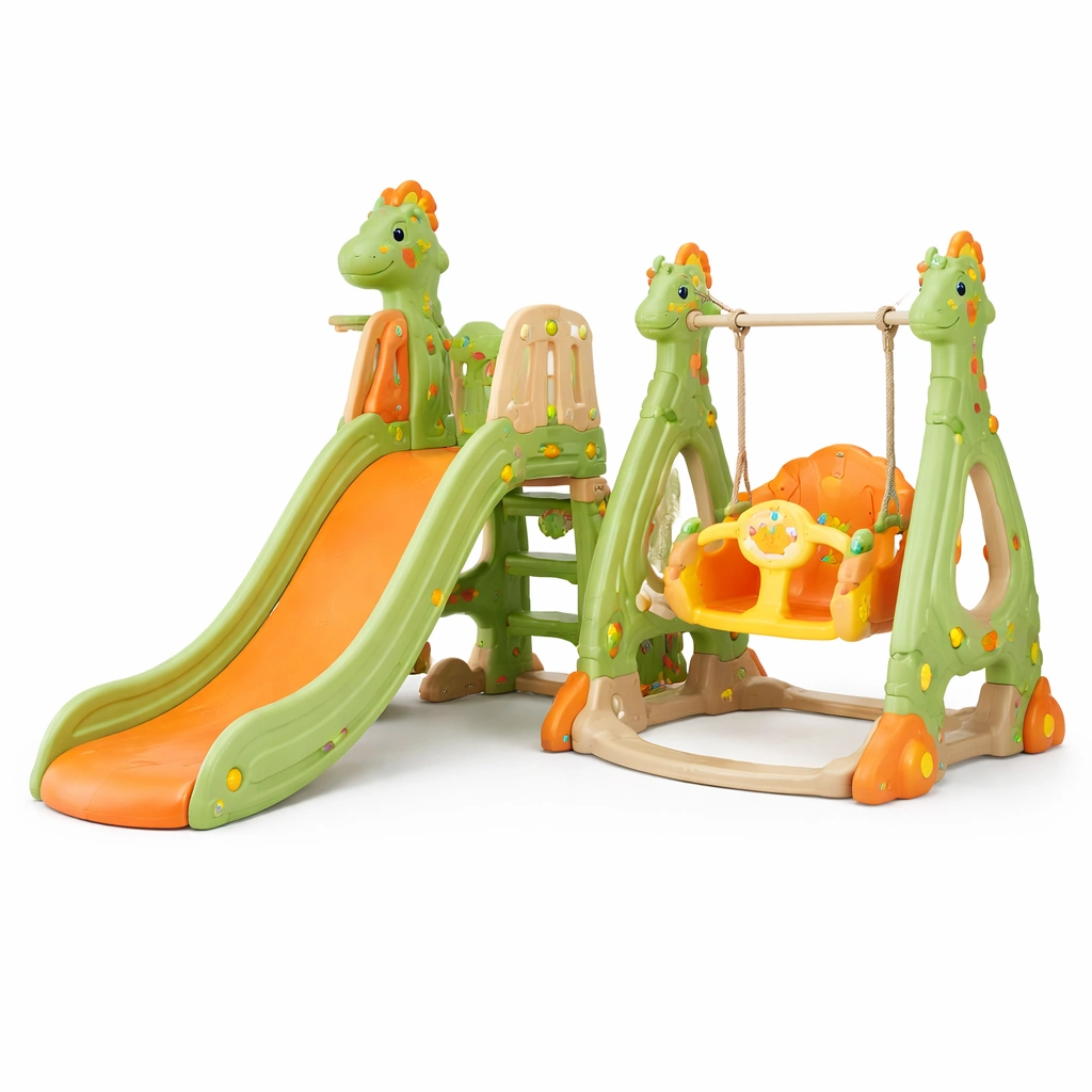 Parque infantil con columpio y tobogán dinosaurio PE verde naranja