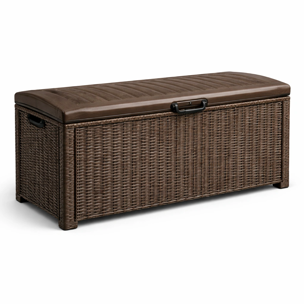 Arcón de almacenamiento para jardín de resina trenzada con asiento de polipropileno marrón