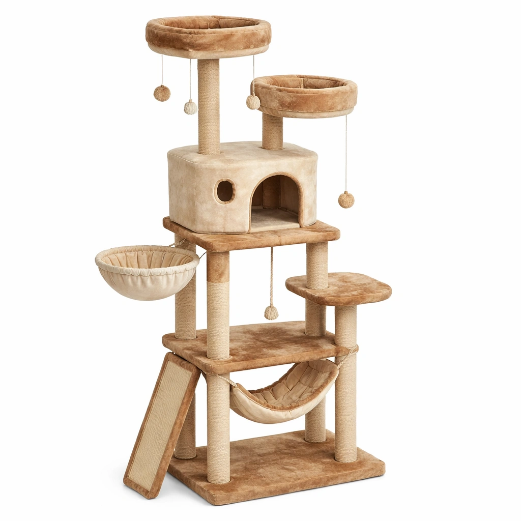 Árbol para gatos de madera contrachapada y felpa con rascadores beige marrón claro