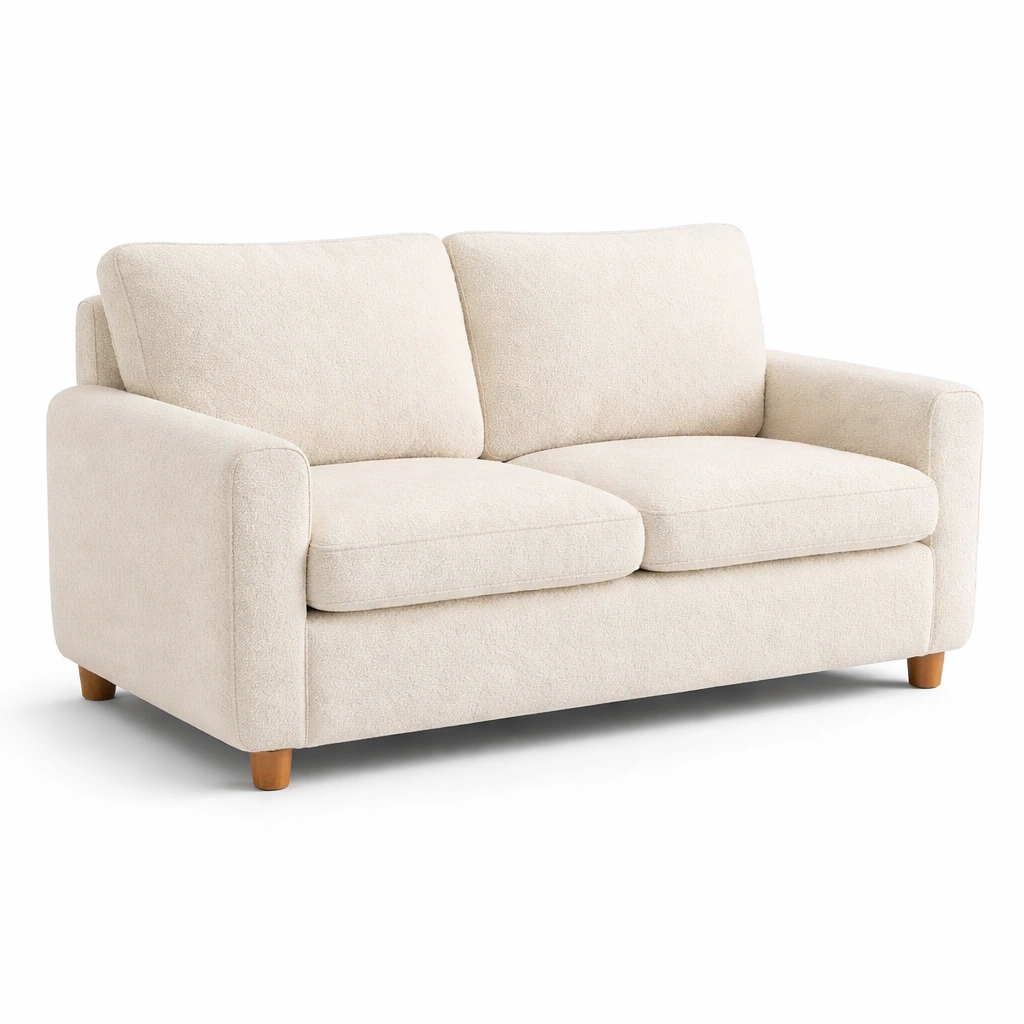 Sofá de 2 plazas beige con tapicería de poliéster y base de madera