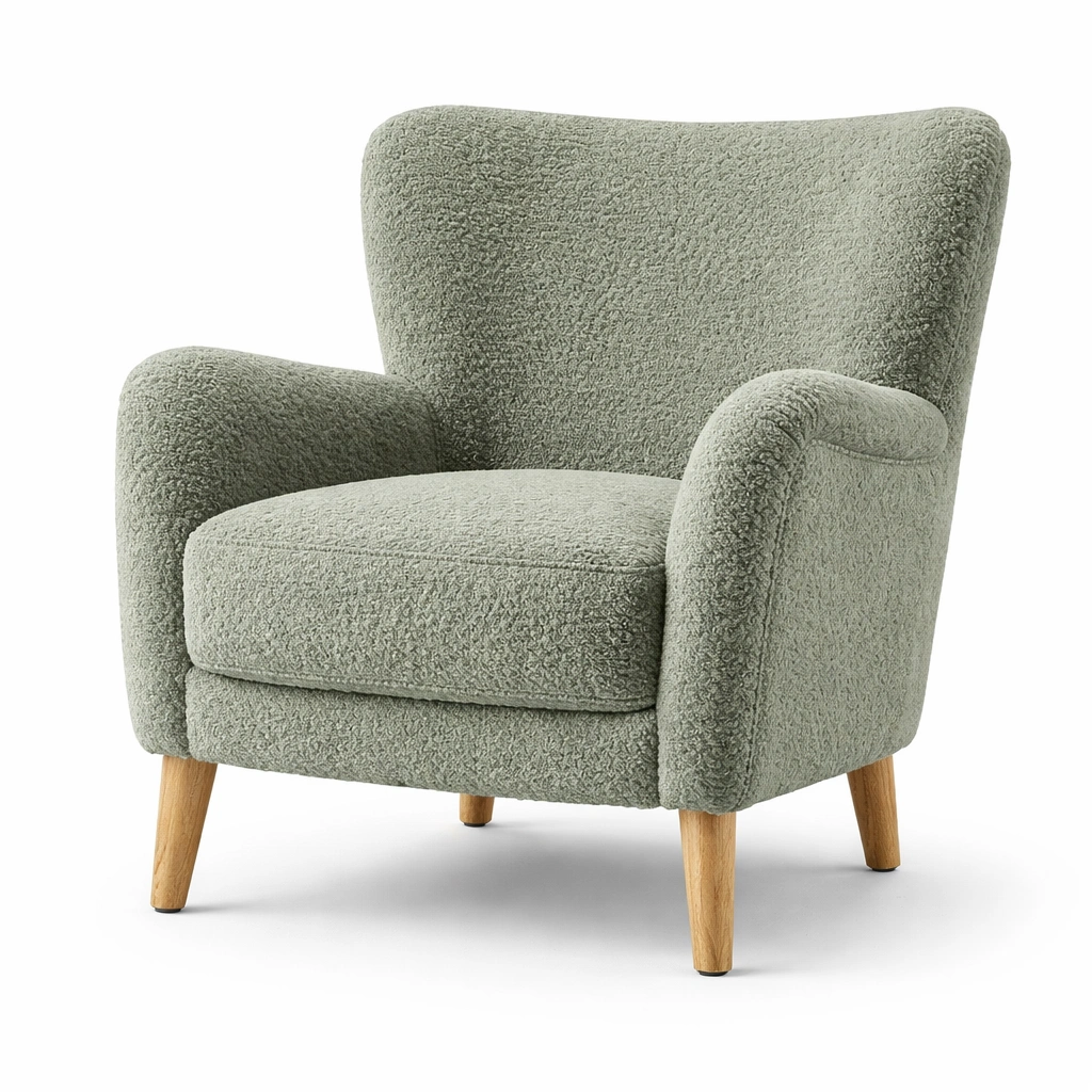Sillón de tela rizada verde con patas de roble