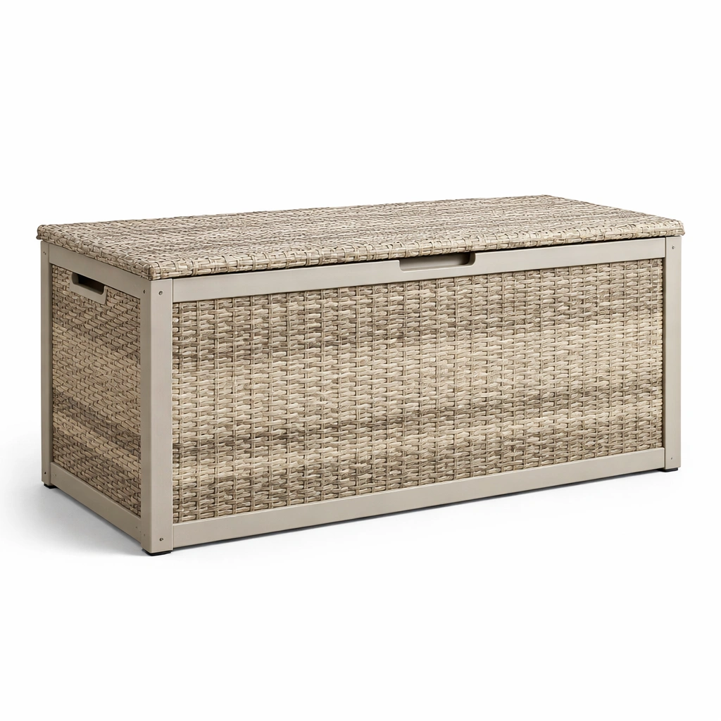 Este banco de almacenamiento está hecho con una estructura de aluminio y un revestimiento de ratán sintético. Las dimensiones son longitud: 120 cm, ancho: 50 cm y altura: 60 cm.