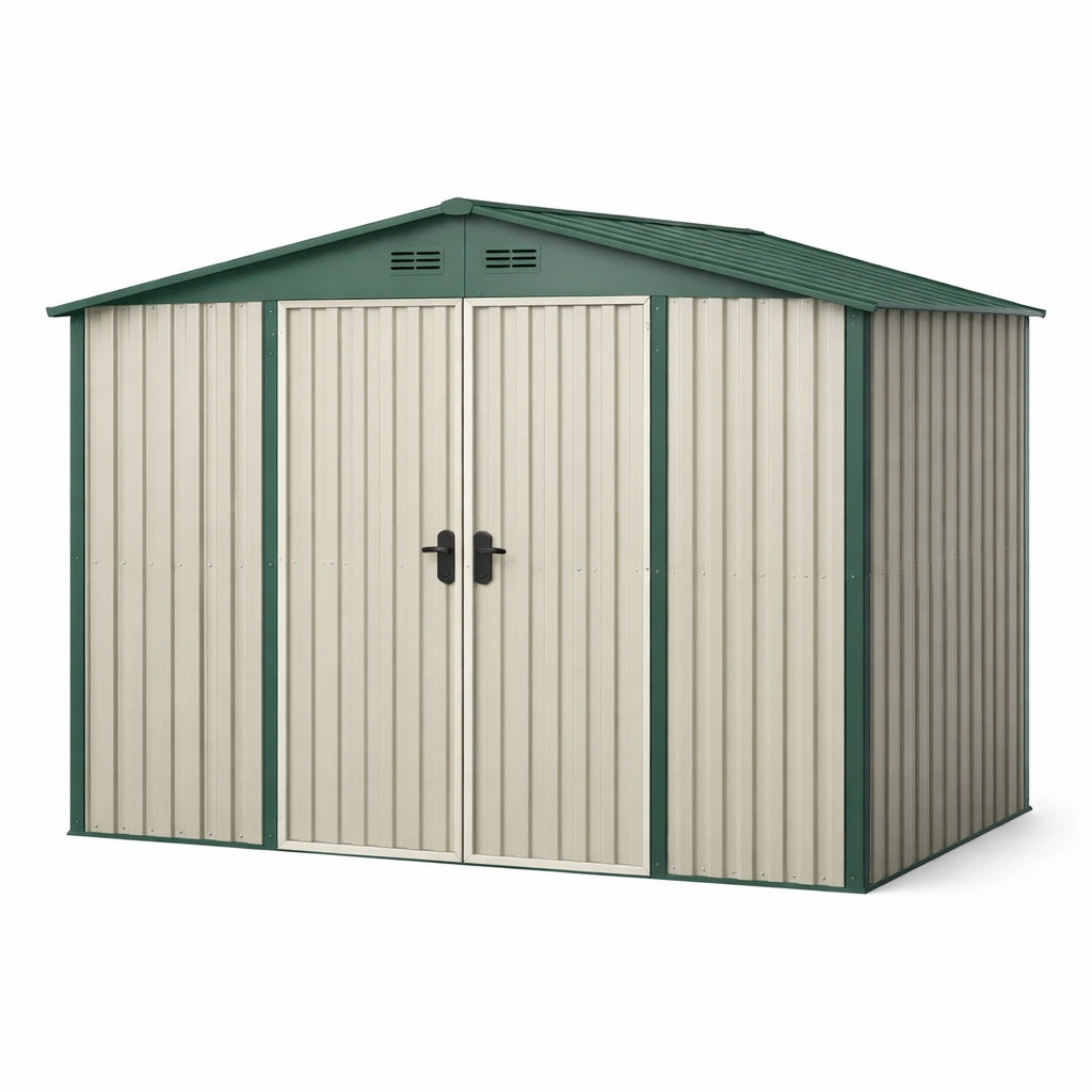 Caseta metálica con dimensiones de 213 cm de largo, 127 cm de ancho y 185 cm de alto. Fabricada con acero galvanizado para resistencia a la intemperie. Cuenta con puertas dobles para facilitar el acceso y aberturas de ventilación superiores para mejorar la circulación del aire.